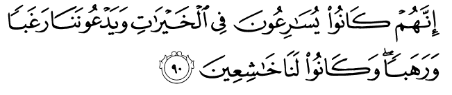 "Verily, they used to hasten on to do good deeds, and they used to call on Us with hope and fear, and used to humble themselves before Us." (Sooratul-Anbiyaa', 21:90)
