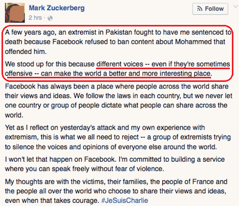 [quote]Zuckerberg also revealed he had received death threats two years ago in response to content depicting the prophet Muhammad on the social networking site.