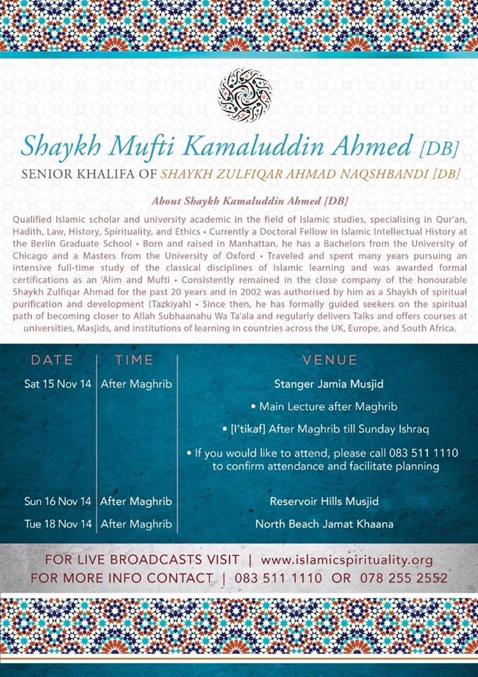 Shaykh Kamaluddin Ahmed in South Africa - DURBAN- 15th to 19th November.